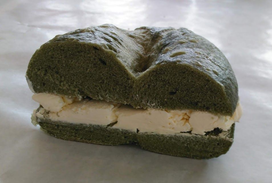 《よもぎベーグル》ベーグルにはクリームチーズがよく合います。塗るというより具材として挟むぐらいの量が丁度いいです。