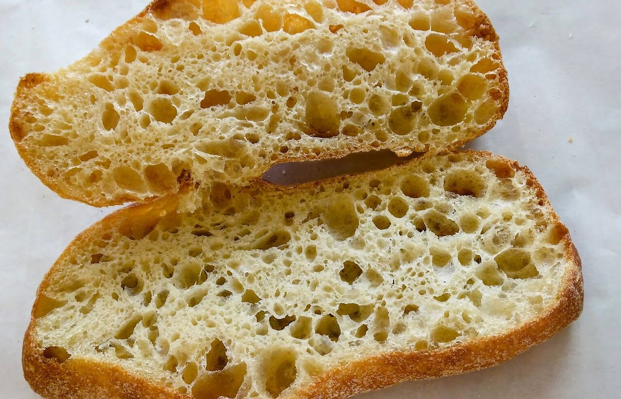 《セモリナチャバタ》セモリナチャバタの断面です。粗い気泡を持つハード系のパンですが、フランスパンよりクラストが薄く軽やかな食感です。