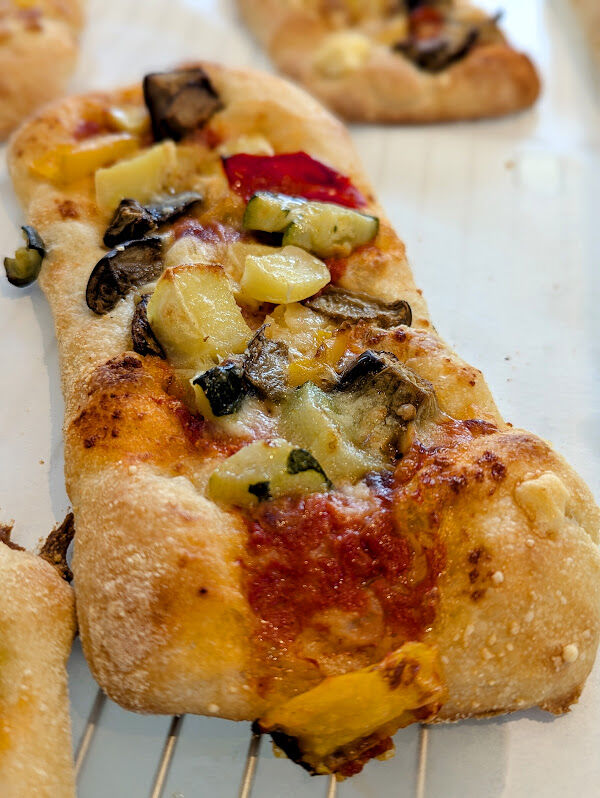 《ナスとパプリカのスキアッチャータ》デュラムセモリナ粉を使ったチャバタの上に、トマトソース、ミックス野菜、パルメザンチーズを乗せて焼きました。
