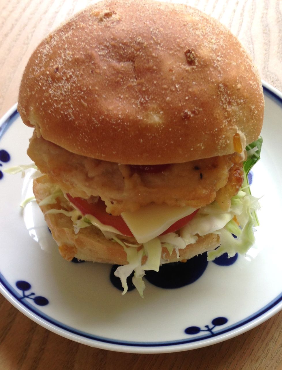キャベツの千切りやトマトなどの野菜とチーズ、チキンをサンドしてみました◎